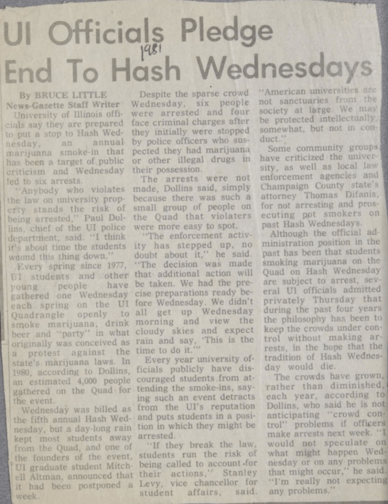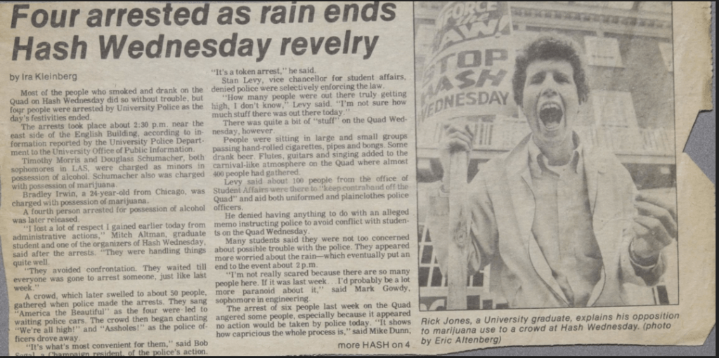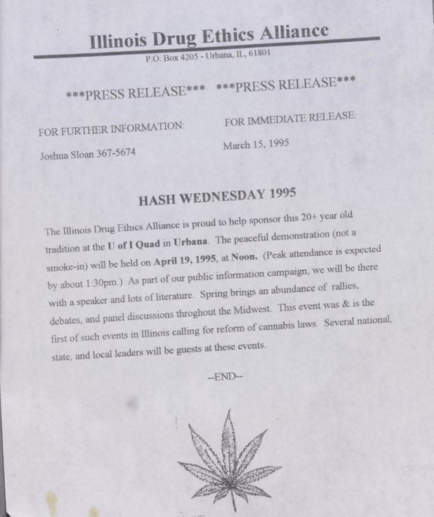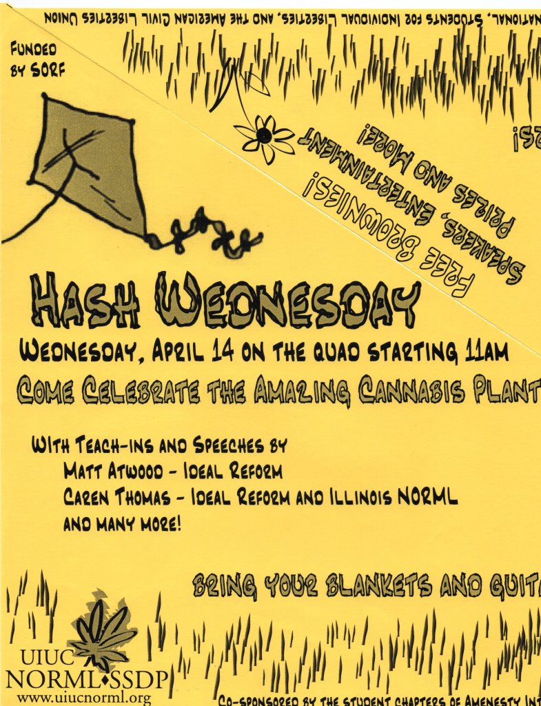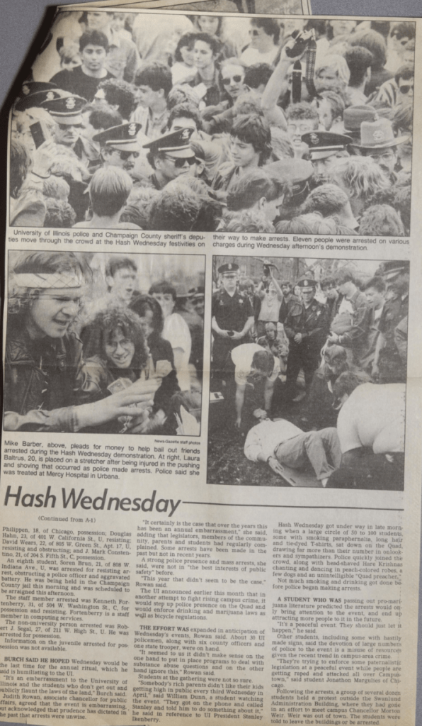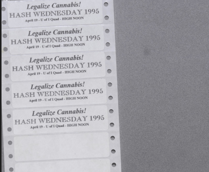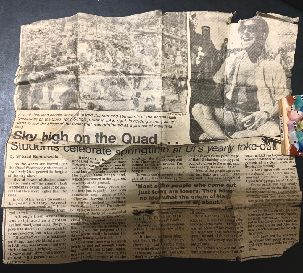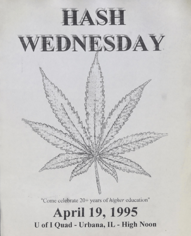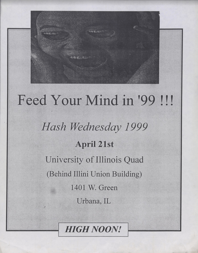Below, you will find photographs, newspaper headlines, press releases, notes, signage, and more, all directly shared with me by participants of past Hash Wednesdays at the University of Illinois.