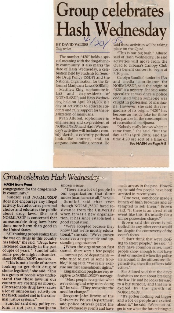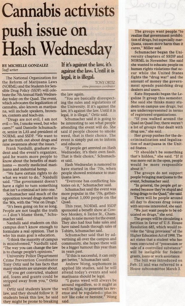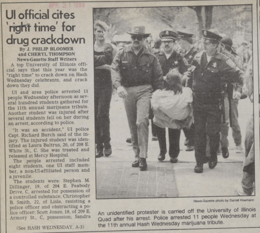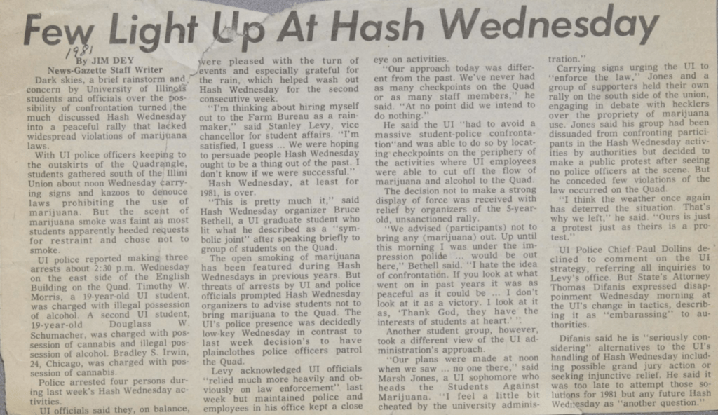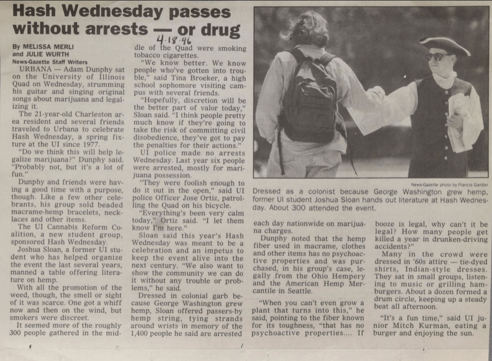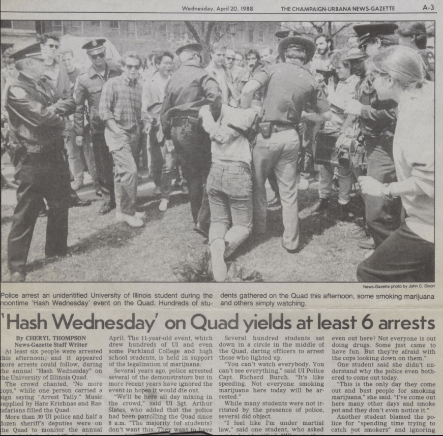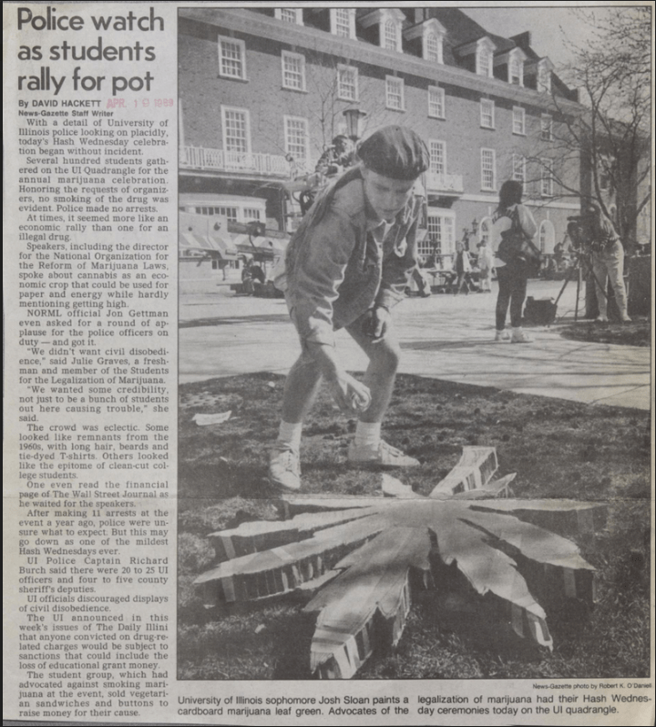 Below, you will find photographs, newspaper headlines, press releases, notes, signage, and more, all directly shared with me by participants of past Hash Wednesdays at the University of Illinois.