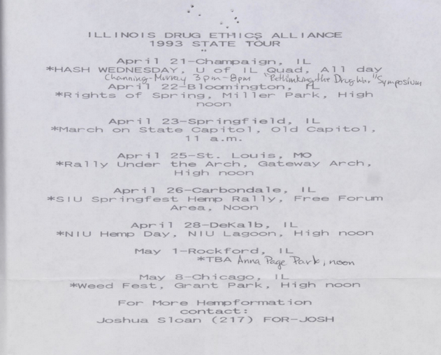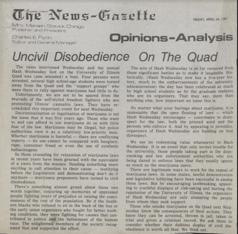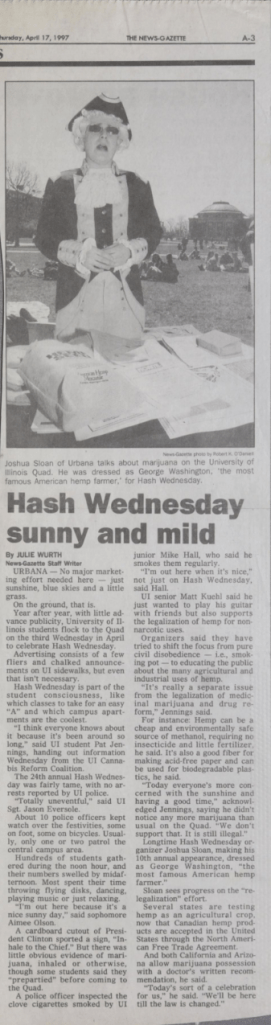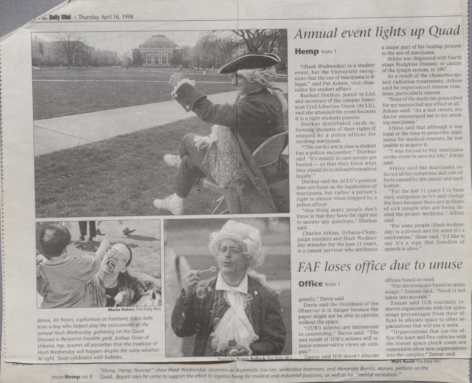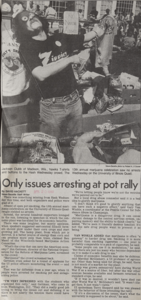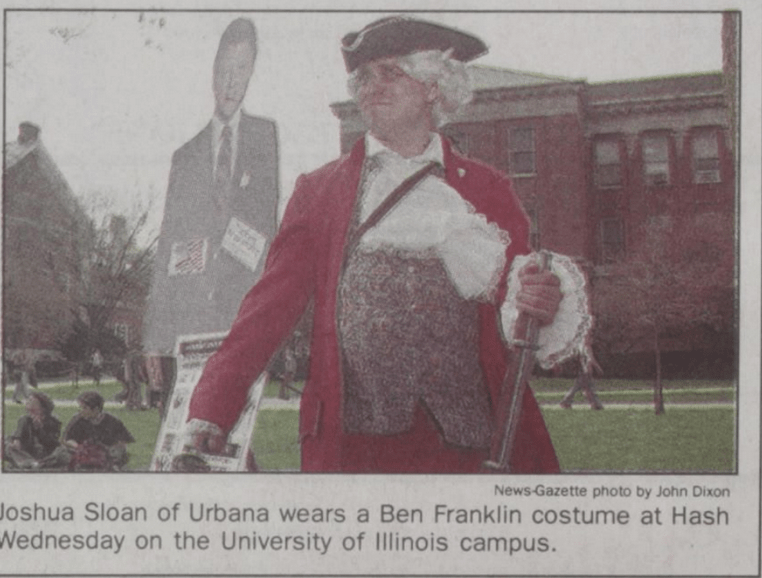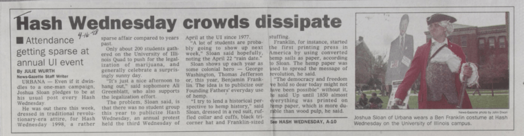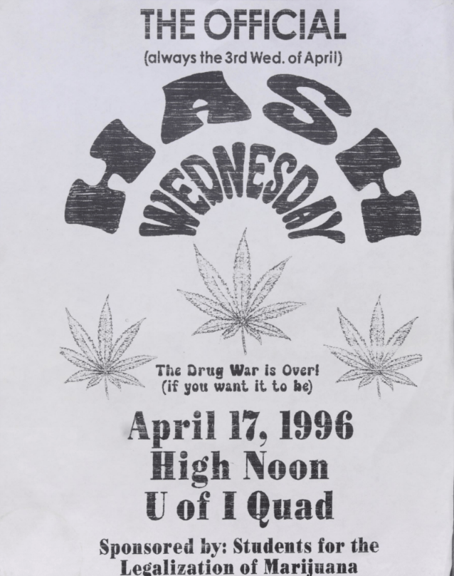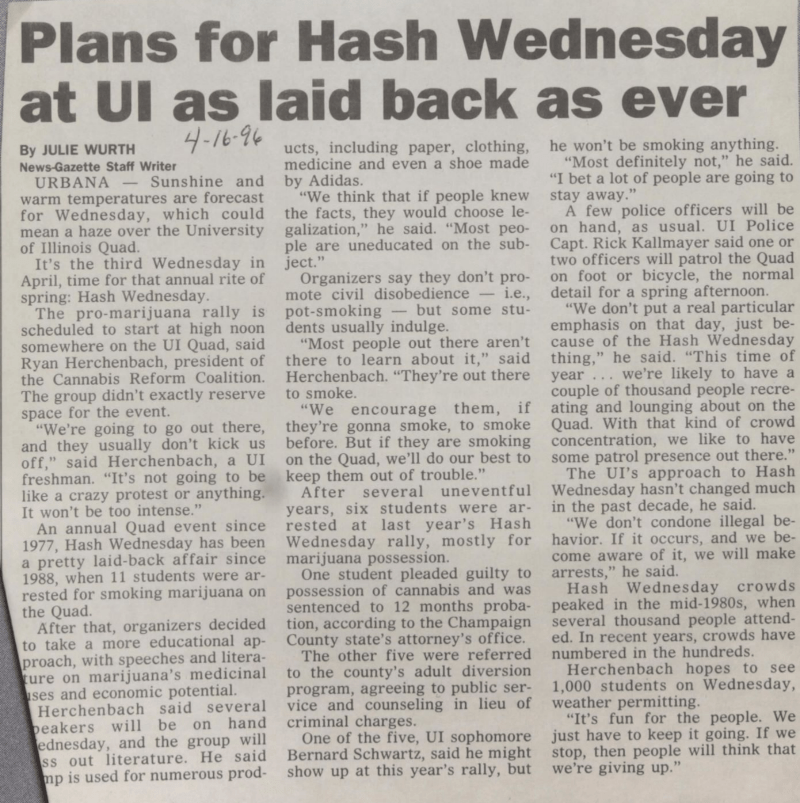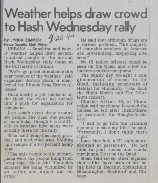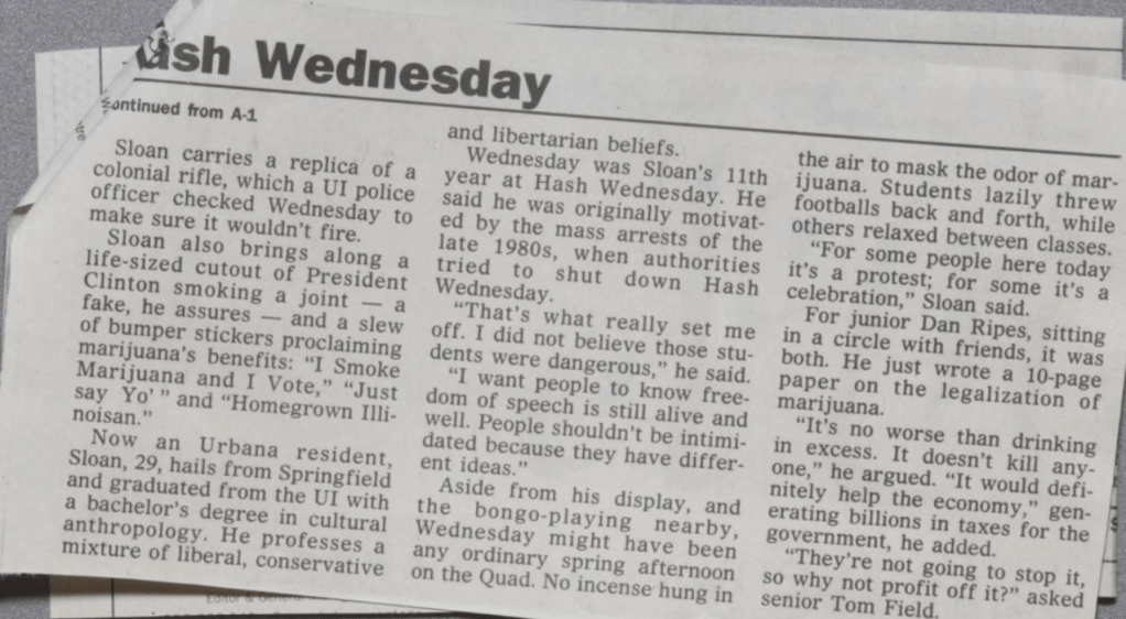 Below, you will find photographs, newspaper headlines, press releases, notes, signage, and more, all directly shared with me by participants of past Hash Wednesdays at the University of Illinois.