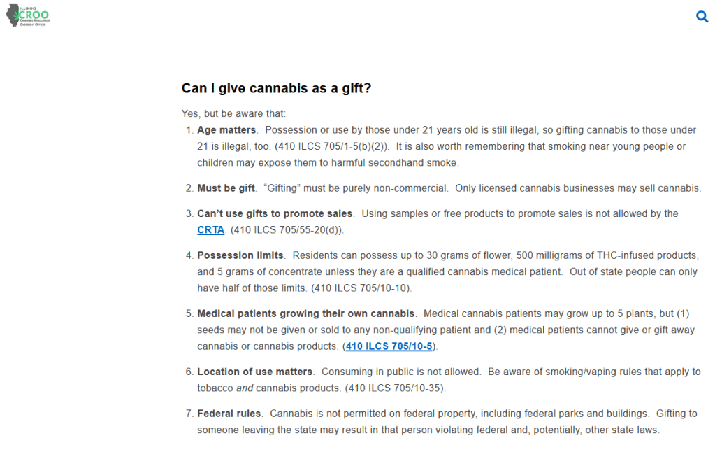 In case you missed it, my attention was drawn to this issue following a recent examination of the Illinois Cannabis Regulation Oversight Office website, where I noticed the absence of any mention of gifting cannabis in their FAQ section. This struck me as significant because, historically, official Illinois Government websites have featured various references to cannabis regulations, including explicit statements affirming the legality of gifting.
