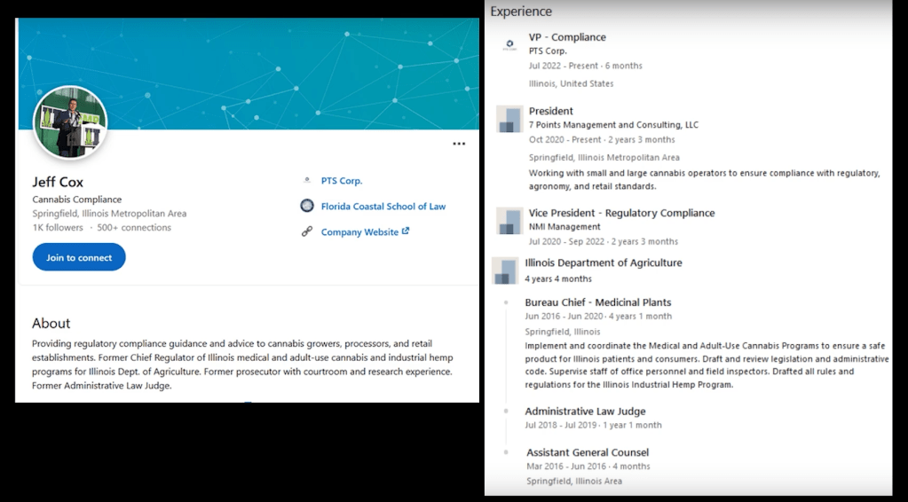 According to the Sun-Times report, Cox was still heading the Illinois Department of Agriculture’s Bureau of Medicinal Plants when Progressive Treatment Solutions (PTS), Verano, and the state’s other cultivators were awarded new licenses to grow recreational marijuana. The Sun-Times had also reported that records showed that George Archos, the chief executive of the massive Chicago-based pot firm Verano Holdings, was also an officer of NMI Management. However, Archos is no longer listed in the company’s state filing. According to his LinkedIn, Jeff Cox currently works as the VP of Compliance at PTS.