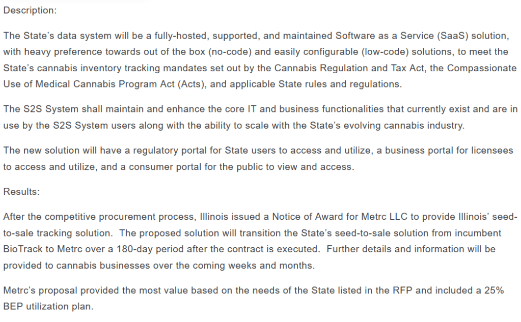 On May 16, 2023, Metrc announced that Illinois planned to award the company a contract for its cannabis seed-to-sale tracking system. According to Metrc’s press release: